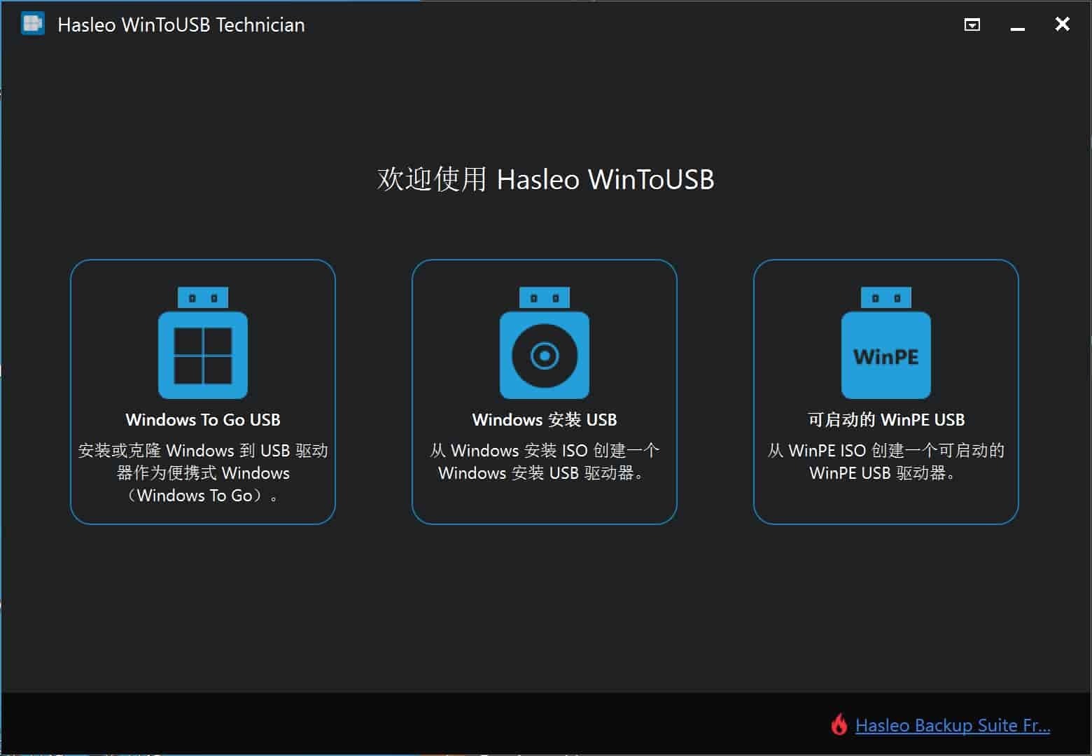 WinToUSB – 轻松将Windows/WinPE安装到USB移动硬盘或者U盘!Hasleo WinToUSB是个免费的U盘安装系统工具。 可以将操作系统ISO/WIM/ESD/SWM文件或CD/DVD光驱安装到U盘或者移动硬盘;Windows To Go转换功能可以将当前的Windows操作系统复制到移动硬盘或者U盘上运行;支持创建基于WinPE的USB启动盘,将WinPE启动镜像或启动光盘的镜像迁移到移动硬盘或U盘上并且保证能从USB设备启动。