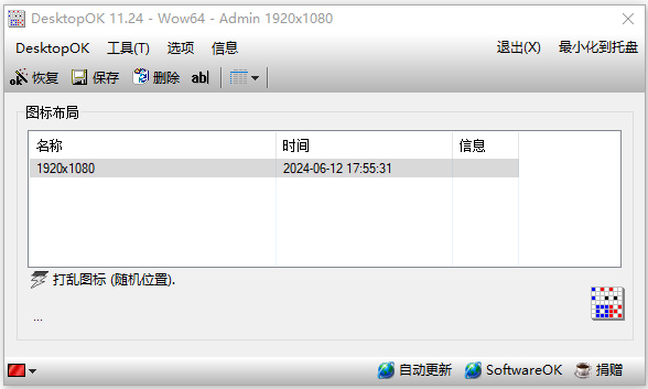 4.便捷的操作:DesktopOK在任务栏中有一个小图标,用户可以通过右键单击该图标来进行保存、恢复、删除等操作。